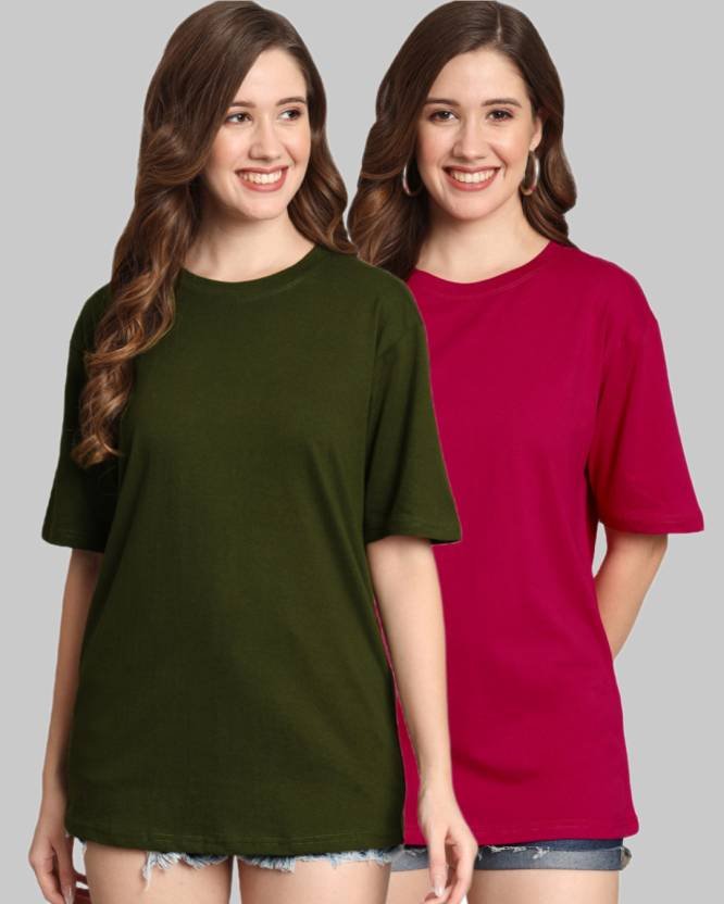 Pack of 2 Women Solid Round Neck Cotton Blend Green, Pink T-Shirt